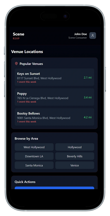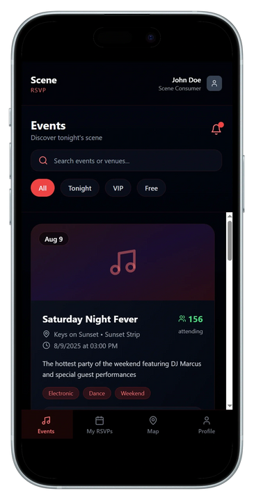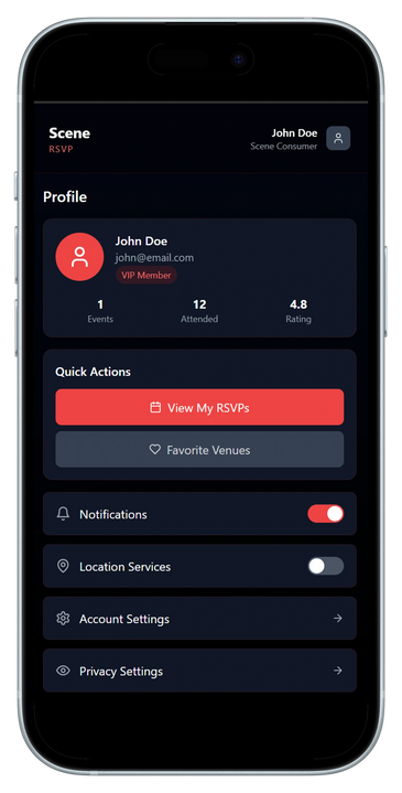 Make it personal with Scene’s Profile Dashboard. Track your RSVPs, favorite venues, and event history, all while managing notifications, location services, and account settings in one place.